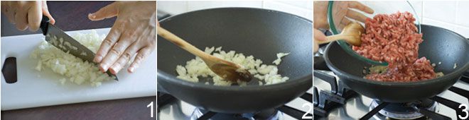 Finely chop the onion 1. In a large pan, sauté the onion until it becomes translucent 2. Add the meat and sauté until it turns golden brown 3.