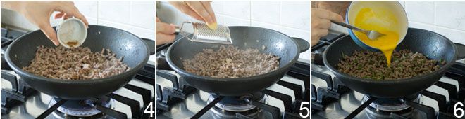Incorporate the cinnamon 4, a bit of freshly ground pepper, a pinch of salt, and the grated ginger 5. Beat the eggs in a separate bowl. Incorporate them into the meat 6 and mix well until they are well combined and the mixture is creamy.