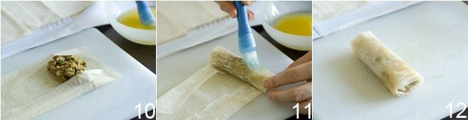 fold the edges lengthwise 10 and roll the cigar onto itself, brushing the outside with melted butter 11. Form all the cigars and place them on a tray lined with parchment paper 12. Bake the cigars in a preheated oven for 45 minutes or until golden brown on both sides.