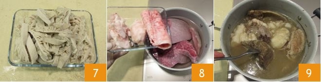 Meanwhile, focus on cleaning the offal: rinse thoroughly under running water, or alternatively, you can ask your trusted butcher for pre-cleaned offal. Boil the tripe for 25 minutes 4, or until the meat is tender, then drain 5 and cut into strips 6.