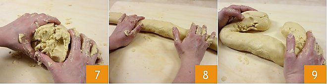 When the ingredients are gathered, transfer the dough onto a floured work surface and continue kneading 7: you should proceed by forming a loaf 8 and then folding the ends towards the center 9. If the dough is still sticky, add more flour.