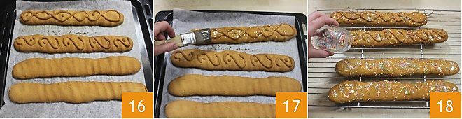 Place the mostaccioli on a baking sheet lined with parchment paper 13. With the remaining dough, form small thin loaves 14 or balls and create decorations to place on the surface 15.