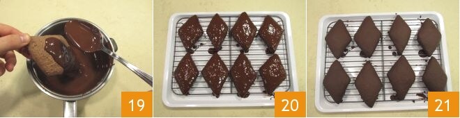 If you prefer, you can dip the mostaccioli directly in the melted chocolate and then let them set on parchment paper. Alternatively, for a more visually appealing result, you can cover one part first by holding the cookies by the tip and drizzling them with chocolate with a spoon 19. Place on a wire rack with a sheet of parchment paper underneath 20, and let dry in a cool place until the chocolate is completely set 21.
