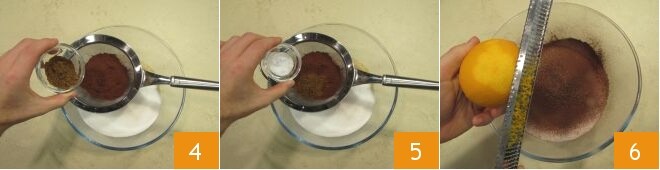 the pisto 4, and the ammonium bicarbonate 5. Finally, grate the orange zest 6