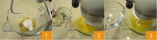 To prepare the mountain sugar cookies, first place the eggs and sugar in the bowl of a stand mixer fitted with a paddle attachment 1. Start working the mixture at medium speed, then add the vegetable oil 2 and the anise liqueur while keeping the stand mixer running 3.