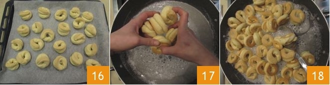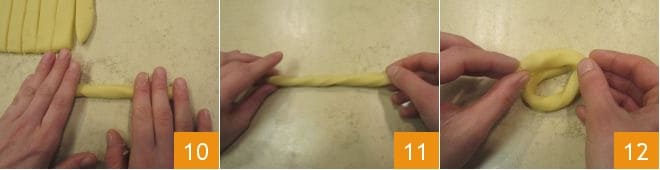 Take one strip at a time and shape it into a cord, rounding it with the tips of your fingers against the work surface 10. Gently twist the ends of the cord 11, then close them into a ring to create a small donut shape 12. Overlap the ends and press gently to ensure they stay attached. Continue this way until you have used all the dough.