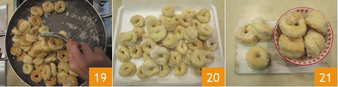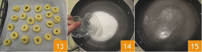 Place the donuts on a baking sheet lined with parchment paper 13 and bake in a preheated static oven at 392°F for 20 minutes, placing it on the middle rack. About 5 minutes before the end of baking, start on the glaze: in a large saucepan, pour in the sugar, water, and anise liqueur 14 and let it simmer over low heat, monitoring the temperature with a thermometer 15.