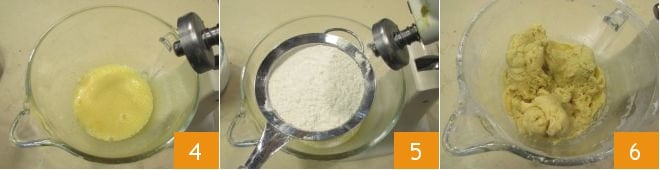 When you have obtained a light and frothy mixture 4, turn off the stand mixer and sift the flour and baking powder into the bowl 5. Turn the mixer back on to combine all the ingredients and obtain a homogeneous dough 6.
