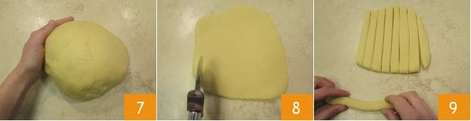 Transfer the dough to your work surface and shape it into a smooth and uniform ball 7. Take about one-fifth of the dough and roll it out with a rolling pin to a thickness of 0.4 inches, then cut strips about 4 inches long and 0.8 inches wide (8-9).
