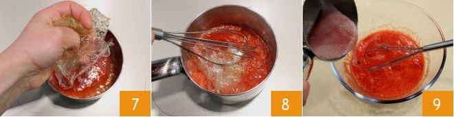 You should obtain a smooth puree 4, which you will then pass through a sieve 5 to remove any lumps and larger seeds: this will yield about 14 oz of strawberry puree. Take two/three tablespoons of strawberry puree and heat it in a saucepan 6,