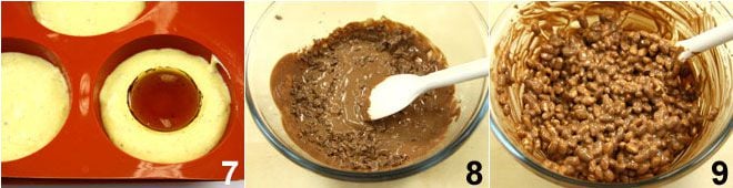 Then pour the mixture into semi-spherical molds about 2.36 inches in diameter, filling them halfway. Then place the set jelly inside 7 and cover with more mousse, filling the molds. Let it rest in the fridge for another 4 hours. Melt ¾ of the milk chocolate bar in the microwave and add the remaining finely chopped, mixing it until it melts 8; then add the puffed rice and mix everything 9.