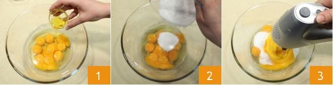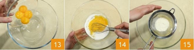 Meanwhile, in a bowl, place the egg yolks 13, add the granulated sugar and mix with a whisk 14 until you get a light and frothy mixture, then incorporate the sifted flour 15.