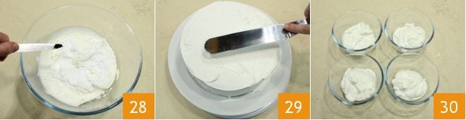 and add them to the freshly whipped cream 28. Divide the cream into 5 parts, take one part to cover the entire cake 29, smoothing the surface with a spatula so that it is very smooth. Transfer the remaining cream into 4 separate bowls 30