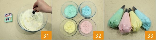 color each cream with a different color by adding a few drops of coloring to the cream at a time until you get the desired color 31; we made pastel colors: pink (with a little red coloring), yellow, green (combining yellow with blue coloring), and blue (with a little blue coloring) 32. Transfer the creams into 4 pastry bags with star tips 33
