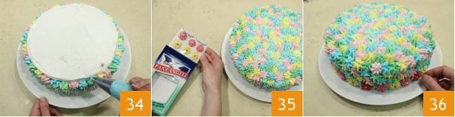 decorate the edge and the entire surface of the cake with tufts of colored cream 34 alternating the colors. Finally, take the sugar flowers 35 and apply them around the entire circumference of the cake 36. The multicolor cream cake is ready; all that's left is to serve it!