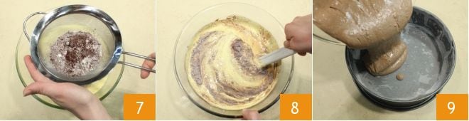 Sift the powders and gather them in the bowl containing the egg mixture 7, mix with a spoon 8 to blend the ingredients. Pour the batter into a 9-inch diameter cake pan, greased and lined with parchment paper 9.