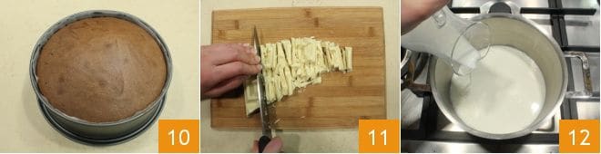 Bake the sponge cake in a static oven preheated to 356°F for 45 minutes (or in a fan oven at 320°F for 35 minutes). Once cooked, remove the pan 10 and let it cool before removing the cake. Now take care of the filling: chop the white chocolate 11, then place a saucepan with the milk 12 on the heat and bring it to a boil.