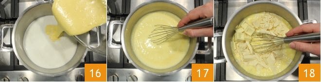 Pour the mixture into the hot milk 16 and, continuing to stir 17, add the chopped white chocolate 18, continue cooking over low heat until the cream thickens.