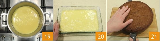 When the cream has thickened 19, turn off the heat and transfer it to a wide glass bowl to cool quickly, making sure to cover it with cling film in contact 20. Meanwhile, the sponge cake will have cooled, remove it from the mold and cut it horizontally to obtain 3 layers 21.