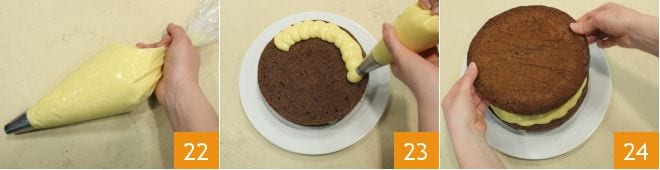 Transfer the cold cream into a pastry bag with a plain tip 22 place the base layer on a serving plate and fill the first layer of sponge cake with the cream 23. Cover with a second layer of sponge cake, fill again with the cream, and close with the third layer of cocoa sponge cake 24.