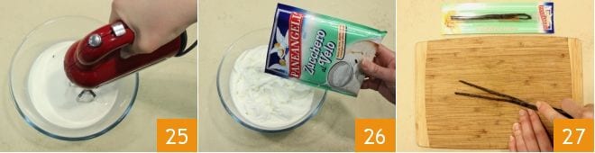 Now focus on the decoration: whip the cream with electric whisks 25 add the powdered sugar 26, then cut a vanilla bean lengthwise, and with a small knife, extract the seeds 27