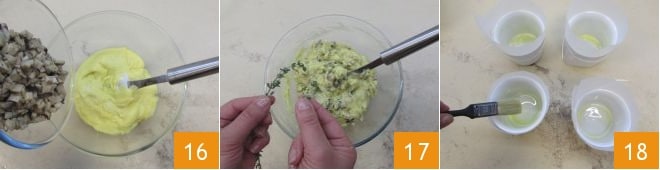 Once cool, add the cooked mushrooms to the mixture 16, add 3g of salt, mix the ingredients, and flavor with a few thyme leaves 17. Set aside the mixture. Then take 6 molds of 3.5 inches in diameter and 2.5 inches in height, line them on the outside with strips of parchment paper 3-3.5 inches thick so that they are taller than the edges and as long as the circumference of each container; secure them with string: this way, your soufflé will expand vertically when rising in the oven. Brush each mold with oil 18.