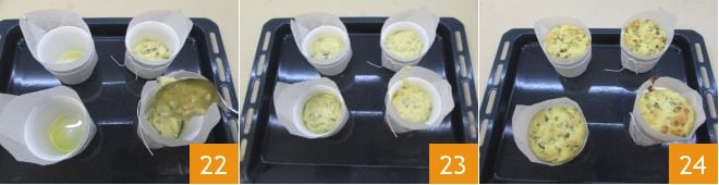 Place the molds on a baking sheet and pour the mixture inside using a small ladle or spoon 22, filling 2/3 of the molds 23. Then bake in a preheated static oven at 320°F for 45 minutes. Once ready, turn off the oven and wait 2-3 minutes before opening it. Then remove and serve your mushroom soufflés immediately!