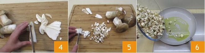 The porcini are now ready: you can slice them 4, then dice them 5. In a pan, sauté the peeled and whole garlic with the oil for a few moments. Then add the porcini 6.