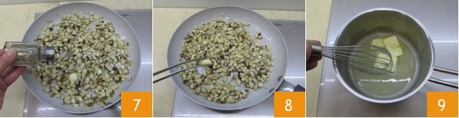 Salt (1g will be enough), add pepper 7, and let cook over low heat for about ten minutes. When the mushrooms are ready, remove the garlic clove with kitchen tongs 8 and set aside. Meanwhile, prepare the soufflé mixture: in a saucepan, melt the butter over low heat, stirring with a whisk 9.