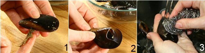 Remove the beard (byssus)1 protruding from each mussel shell, discard the broken ones 2, and clean the shells of the remaining mussels by scrubbing them (or scrubbing them with a new steel wool pad)3, then rinse them under running water and drain.