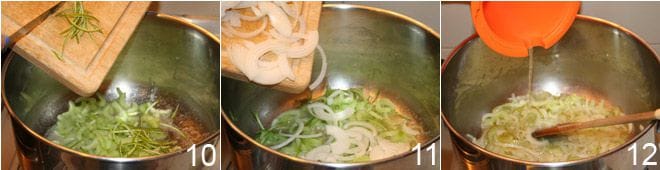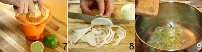 Squeeze the lime 7 and set the juice aside. Peel and cut the onion in half, then slice the two halves into pieces about 1/10 inch thick 8. In a large pot, melt the butter and then add the celery, 9 lime zest 10, and onion 11;