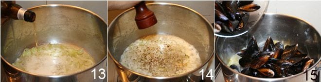 Cook the ingredients for a few minutes, then add the ground pepper 14 and the mussels 15. Mix the ingredients well and cook everything on high heat until the shellfish are fully opened, then turn off the heat and serve immediately, accompanied by stick-cut fries.