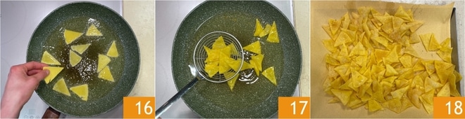 Move on to cooking: in a large pan, heat about ¾ inch of vegetable oil to 356°F, then add a few triangles at a time 16. After a couple of minutes, turn them with a slotted spoon and fry for another 2 minutes. Drain the nachos 17 on paper towels and let them cool completely 18. At this point, the nachos can be enjoyed plain or seasoned!