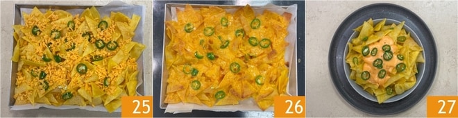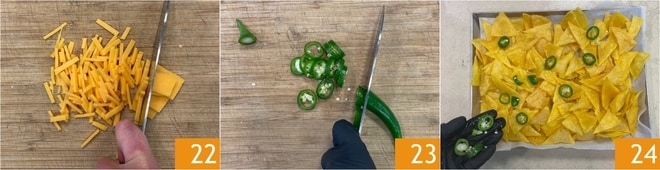 To make cheese nachos, finely chop the cheddar 22 and slice the chili pepper into rings 23. Arrange the nachos on a baking sheet lined with parchment paper and garnish with the jalapeno rings 24.
