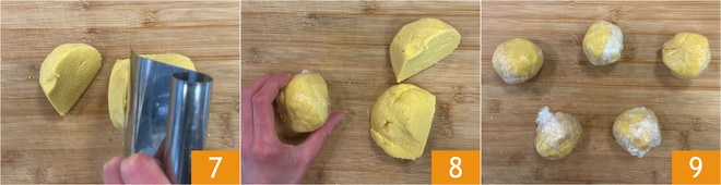 Divide the dough into 5 portions of about 3.5 oz each 7, shape each piece into a round shape 8, and wrap them in plastic wrap 9. Let them rest at room temperature for 5 minutes.