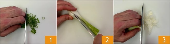 To prepare nasi goreng, first get all the ingredients ready: thinly slice the green part of the scallion 1, then cut the white part lengthwise 2 and julienne it 3.