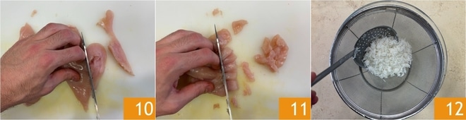In the meantime, clean the chicken breast 10 and cut it into approximately 1-inch pieces 11. Once the rice is cooked, drain it and let it cool in a colander 12.