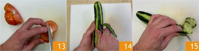 Also prepare the ingredients for decoration: cut the tomato into wedges 13, then peel the cucumber in alternating strips 14 and slice it thinly 15.