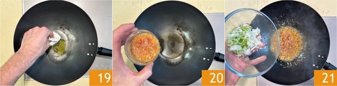 Move to the stove: grease a wok with vegetable oil using a paper towel 19, turn on the heat and add the garlic and chili sauce 20. Stir-fry for a minute over high heat, then add the white part of the scallion 21.