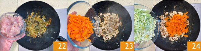 After a minute add the chicken 22 and briefly brown it. When it starts to change color, add the carrots 23 and cabbage 24 and toss everything.