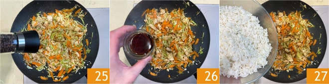 As soon as the vegetables have softened, season with salt and pepper 25, then deglaze with soy sauce 26 and mix well to flavor. At this point, add the rice 27.