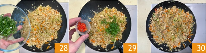 Toss everything over high heat for a few minutes, then add the green part of the scallion 28 and the remaining half of the chili 29. Stir again and turn off the heat 30.
