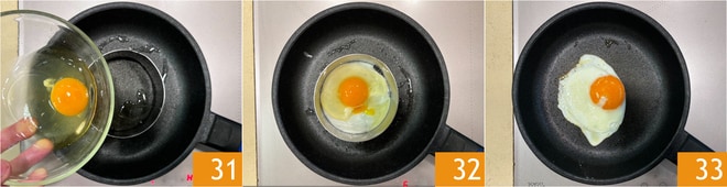Grease a separate pan with vegetable oil, place a pastry ring inside and pour an egg into the center 31. Cook over low heat for a few minutes 32 adding a pinch of salt, until the white is cooked, and the yolk is still soft 33. Proceed in this way to cook the other eggs (alternatively, you can cook them simultaneously using a larger pan).