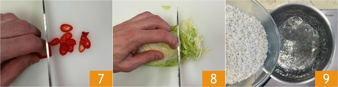 Cut the chili into slices 7 and julienne the cabbage 8. Bring a pot of salted water to a boil and cook the basmati rice for 8 minutes 9.