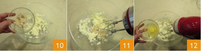 At this point, add the almond cream prepared earlier 10 and work again with the mixer 11 until you get a uniform mixture. Then add the whole egg 12