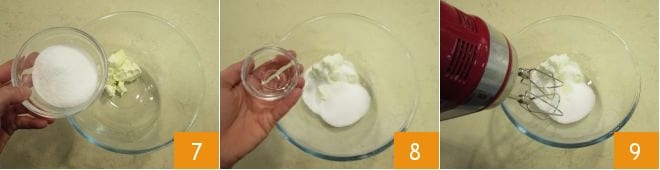 the sugar 7, and the bitter almond essence 8. Work everything with an electric mixer 9 for a few minutes until the butter is whipped.