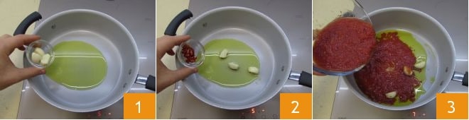 To prepare the Neapolitan-style cod dish, first cook the tomato sauce: in a pan with a bit of extra virgin olive oil, sauté the peeled garlic 1, then add the chopped chili pepper 2, and after a couple of minutes of browning, add the tomato pulp 3 and let it cook for about 15 minutes.