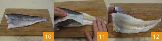 In the meantime, take the cod 10 already desalted (if it was salted, you must leave it in water for 3 days, changing the water 2 or 3 times a day to desalinate it), remove the skin 11, and take out the bones using tweezers.