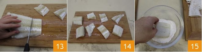 Cut it 13 into 8 pieces 14, then in a bowl with flour, thoroughly coat each side, shaking off the excess flour by gently tapping it against the sides of the bowl containing the flour.