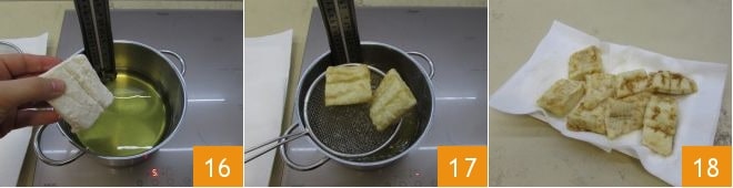 In a saucepan, pour the seed oil and fry it until it reaches a temperature of 356°F-374°F, then fry the cod pieces, ensuring the oil temperature doesn't drop abruptly, frying 2 pieces at a time, for about 2-3 minutes depending on the thickness. Once cooked, drain them on absorbent paper 18.